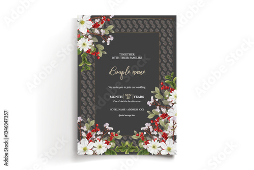 WEDDING INVITATION FRAME WITH FLOWER DECORATIONS AND FRESH LEAVES
