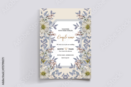 WEDDING INVITATION FRAME WITH FLOWER DECORATIONS AND FRESH LEAVES