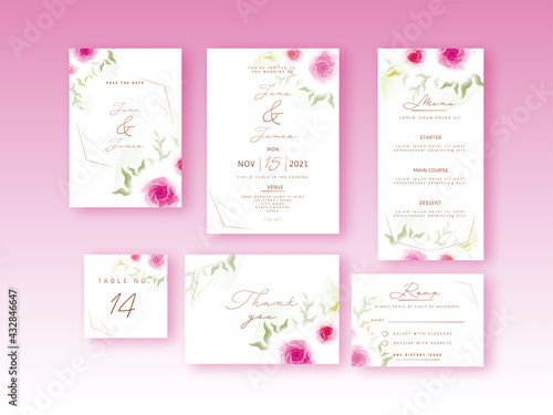 Wedding Invitation, Menu, Save The Date, Table Number, Kindly Reply Or RSVP And Thank You Card Decorated Pink Rose Flowers.