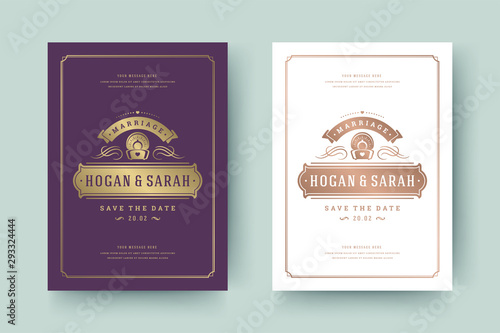 Wedding invitation save the date card golden flourishes ornaments vignette swirls vector template.