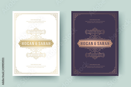 Wedding invitation save the date card template golden flourishes ornaments vignette swirls