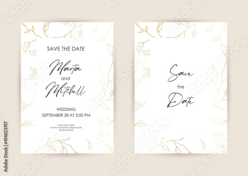 Wedding Invitation with Gold Flowers and gold geometric line design. Cover design with an ornament of golden leaves. vector eps10