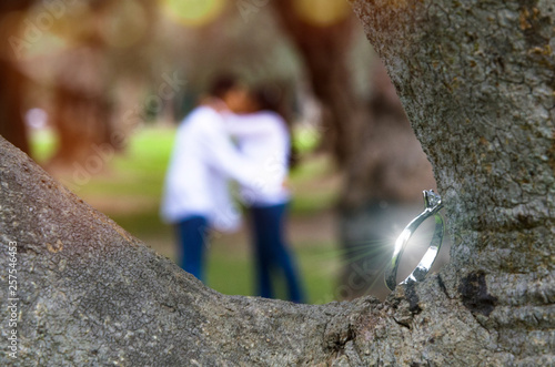 Wedding ring for the bride and groom the day of the wedding. In the background unfocused couple kissing in a park.