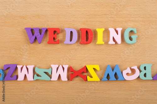 WEDDING word on wooden background composed from colorful abc alphabet block wooden letters, copy space for ad text. Learning english concept.