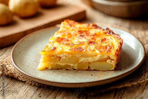 Wedge of potato tortilla on a plate, showing layers of egg and potato. Classic Spanish style food meal in a rustic setting