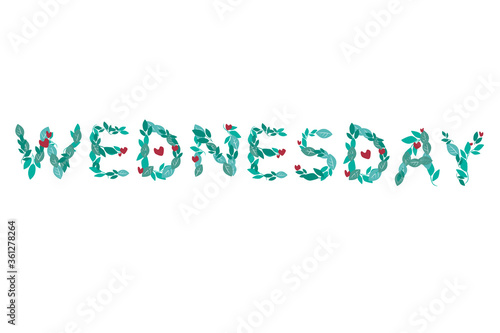 Wednesday as text or word with font from green leaves isolated on white background for organizer or bullet journal, vector stock illustration with text of the day of the week
