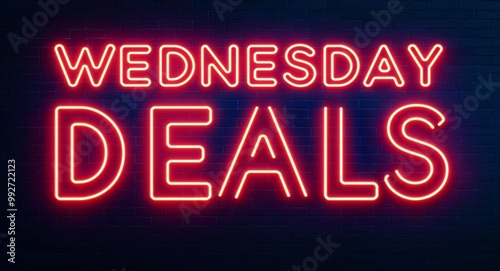 Wednesday deals word lettering glowing with neon light on dark brick wall background