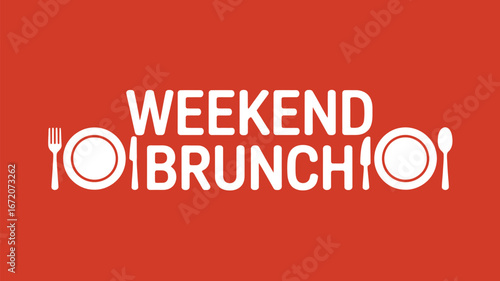 Weekend brunch promotional graphic with white text and utensils against a red background design style