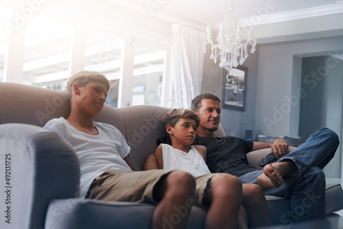 Weekends are for watching their favourite shows together. Cropped shot of a father and his two young sons relaxing together at home.
