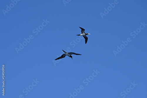 Weißbauchtölpel, fliegend, auf Nahrungssuche / Fischfang über dem Meer unweit der Küste