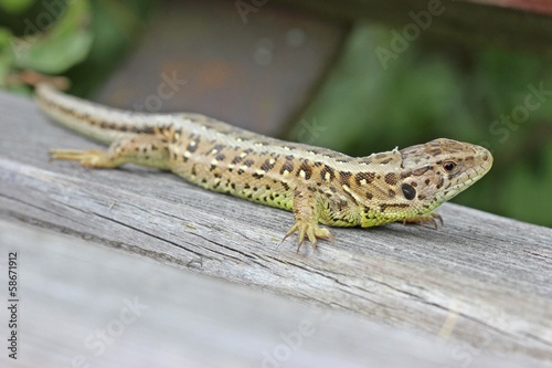 Weibliche Zauneidechse (Lacerta agilis) sonnt sich auf Ruhebank