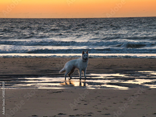 Weißer Hund (Schäferhund) steht auf dem Watt der Nordsee, deren Wellen im Hintergrund am Strand im romantisch glühenden Sonnenuntergang brechen