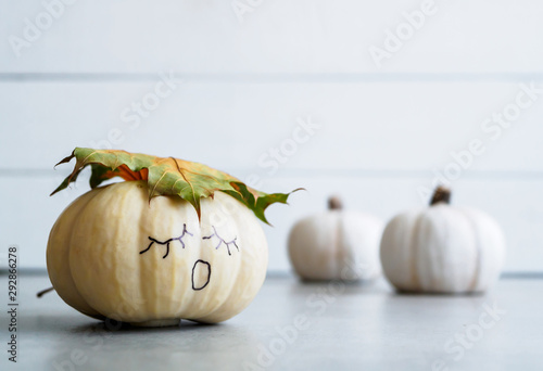 Weißer Kürbis mit einem Herbst Blatt und einem aufgemalten Gesicht aulf einem weißen Holztisch, Halloween