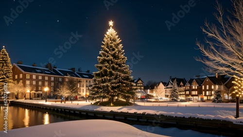 Weihnachtlich dekoriertes Haus in verschneiter Landschaft mit festlichen Lichterketten und Schnee auf dem Dach, Weihnachtsbaum im Garten, Weihnachtsstimmung, Berge und Schneelandschaft