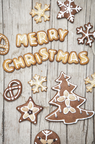 Weihnachtlicher grauer Holz Hintergrund mit Lebkuchen und Merry Christmas