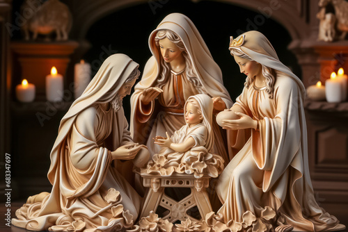 Weihnachtskrippe, Krippenszene mit Holzfiguren, Generative AI