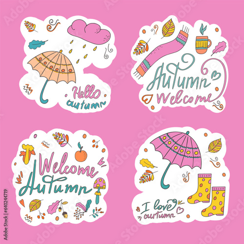 Welcome autumn. Sticker with autumn elements and lettering. Sticker or design with space for text. Hand drawn in doodle style. Isolated illustration. Vector