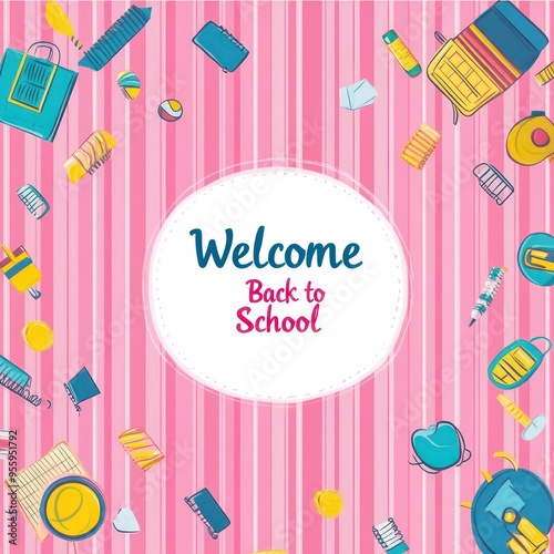 Welcome Back to School Illustration with Pink Stripes and School Supplies