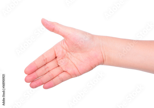 Welcome greetings or agreement symbols, open palm hand isolated on white background.