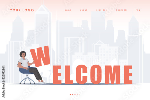 Welcome landing page. A man sits and holds the letter W in his hands. The start page of the site. Trendy flat style. Vector illustration.