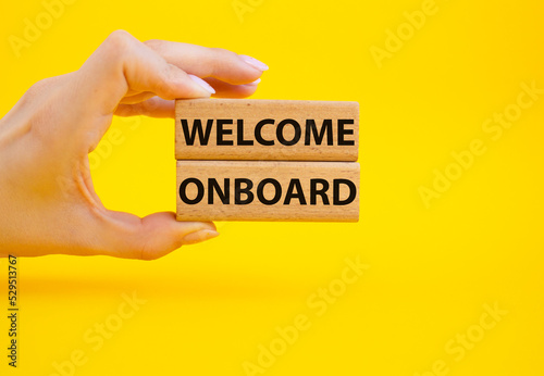 Welcome onboard symbol. Concept words Welcome onboard on wooden blocks. Beautiful yellow background. Businessman hand. Business and Welcome onboard concept. Copy space.