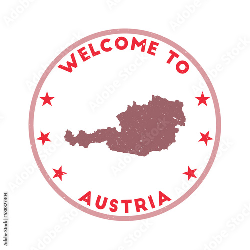 Welcome to Austria stamp. Grunge country round stamp with texture in Imperial Red color theme. Vintage style geometric Austria seal. Charming vector illustration.