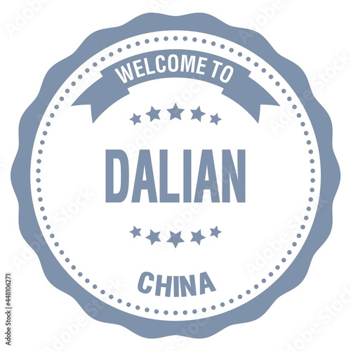 WELCOME TO DALIAN - CHINA, words written on gray stamp
