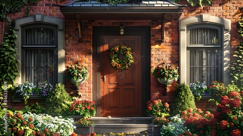 Welcoming Brick Facade of a Charming Traditional Family Home with Cozy Floral Entrance