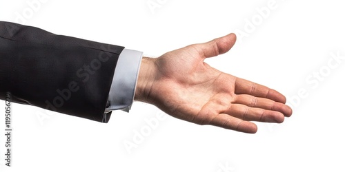 Welcoming gesture of a businessman in a black suit with rolled-up sleeves showing an open right hand against a clean white background.