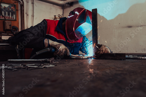 Welder erecting technical steel. Industrial steel welder in factory technical