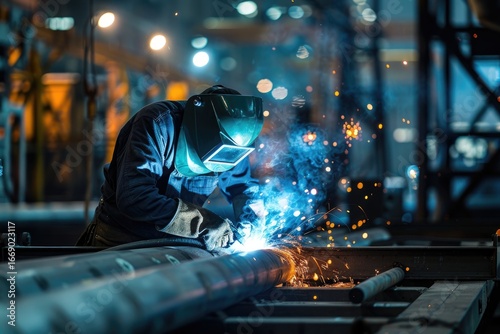 Welder fabricating pipes in industrial plant at night