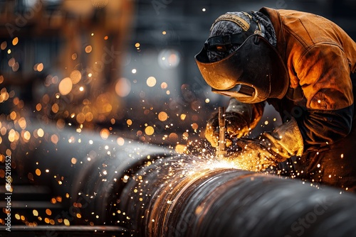 Welder in Protective Gear Working on Large Steel Pipe with Sparks Flying in Industrial Construction Site Setting