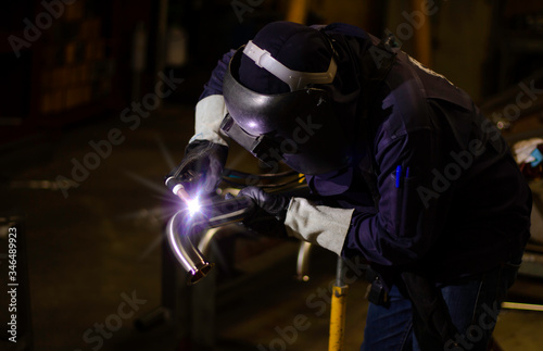 Welder is welding the steel in the factory. Weld the steel in dark. Workers wearing industrial uniforms and welding masks at a welding factory protect from welding sparks. Occupational safety concept