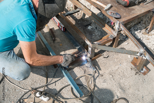 Welder welds metal structure. Construction worker at work. A working welder builds or repairs a new porch and facade of a building or structure. Construction and repair work on the street outdoor.