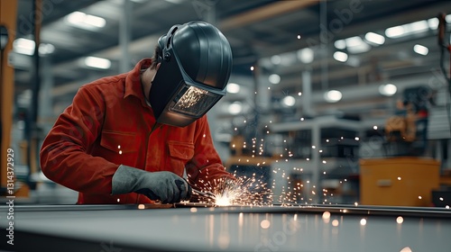 Welding worker in red gear uses a welding machine to create a stainless steel frame, with sparks lighting up his face in a factory