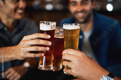 Well earned and ready to drink. Closeup of a group of young friends seated at a table together while enjoying a beer and celebrating with a celebratory toast inside a bar.
