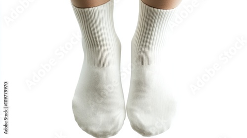 Well-groomed female feet in soft cotton socks on a clean white background showcasing comfort and relaxation for lifestyle and wellness themes