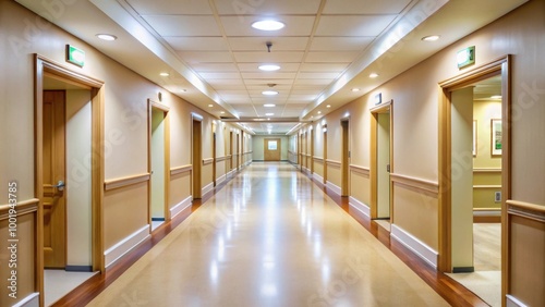 Well-lit and neat corridor in a nursing home setting, nursing home, corridor, hallway, well-lit, neat, clean