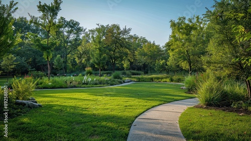 Well-maintained urban park with diverse plant species, walking paths, and a peaceful atmosphere