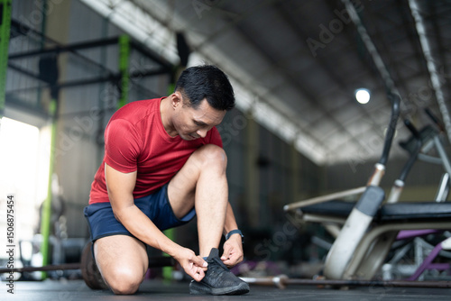 Wellness and Fitness. Man tying shoelaces in gym, preparing for workout.