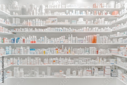 Well-stocked pharmacy shelves with various medicine and healthcare products.