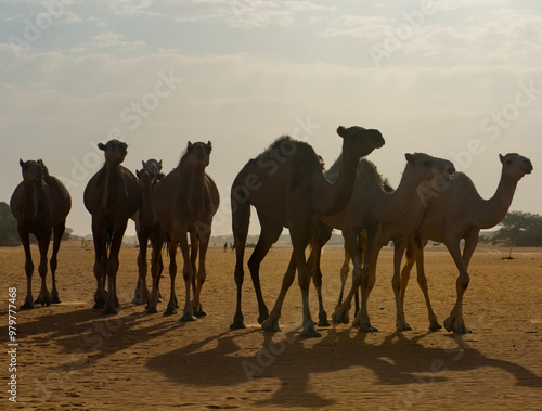 West Africa. Mauritania. A herd of one-humped camels in the harsh dawn light moves across the sands of the Sahara Desert in search of food and water.