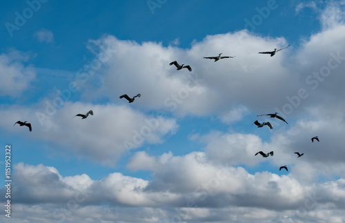 West Africa. Senegal. A small flock of pelicans fly together against the background of clouds and blue sky.