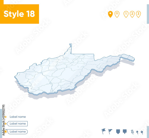 West Virginia, USA - 3d map on white background with water and roads. Vector map with shadow.