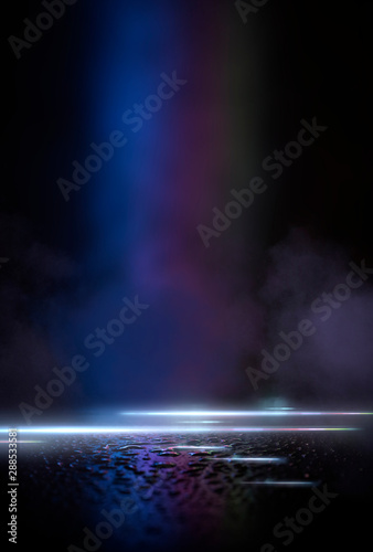 Wet asphalt, reflection of neon lights, a searchlight, smoke. Abstract light in a dark empty street with smoke, smog. Dark background scene of empty street, night view, night city.