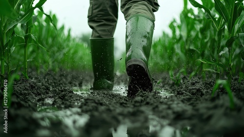 Wet green boots walking through muddy cornfield during rainy season, close-up view from ground level showcasing agricultural activity and nature