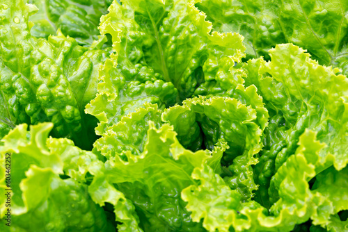 Wet leaves of fresh young green lettuce close-up. New harvest. Useful greens. Health, vegetarian food. Locally grown. Selective focus, defocus. Top view