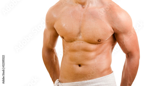 Wet muscular sexy man wrapped in the towel, isolated on white