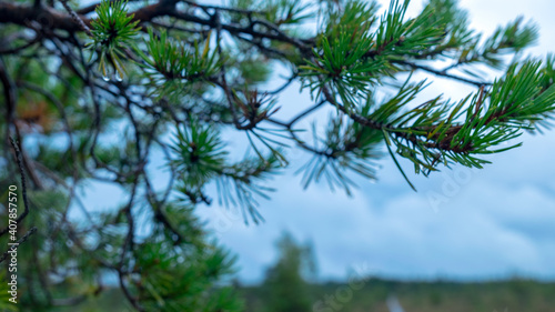 wet pine needles, rain drops fallen into needles, blurred background, rainy weather