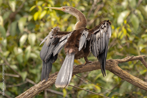 Wężówka amerykańska łac. Anhinga anhinga susząca skrzydła na gałęzi. Fotografia z Santa Rosa Reserve Natural Gamboa w Amazonii w Peru. Other names snakebird darter, American darter, or water turkey
